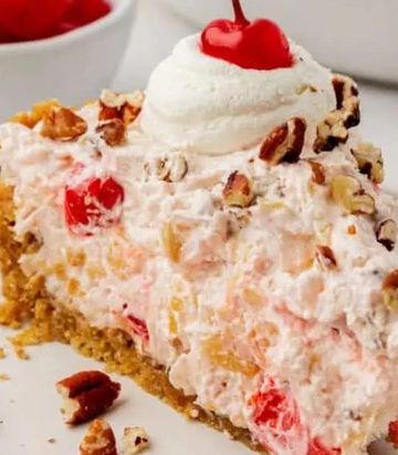 Our favorite! Loaded with crushed pineapple, coconut, and pecans. Folded into a sweet, light and fluffy filling, topped off with maraschino cherries on our graham cracker crust. Simply the Best!